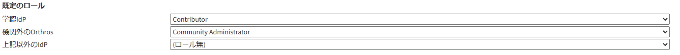 [ System Administrator, Repository Administrator, Contributor, Community Administrator, (ロール無)] | リストボックス | N/A | [機関外のOrthros]経由でログインしたユーザーのデフォルトロールを設定する。 | |