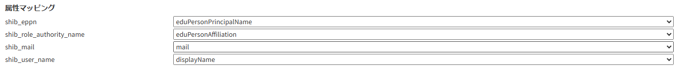['mail', 'sn', 'o', 'ou', 'givenName', 'displayName', 'eduPersonAffiliation', 'eduPersonPrincipalName', 'eduPersonEntitlement', 'eduPersonScopedAffiliation', 'eduPersonTargetedID', 'eduPersonAssurance', 'eduPersonUniqueId', 'eduPersonOrcid'] | リストボックス | N/A | 初期値は'eduPersonAffiliation' | |