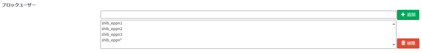 テキストボックス | N/A | アカウント作成前にブロックしたい新規ユーザーのePPNを入力する。 ワイルドカードでの指定も可能。 |